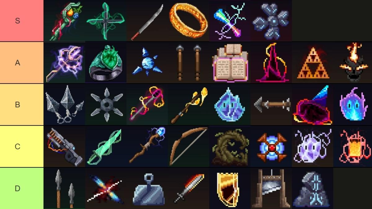 The above tier list provides acomplete overview of each of the weapons, modifiers, and effects currently available in Rogue Genesia. The S-tier ones are the best picks with the highest stats boosts and overpowered weapon abilities, while the D-tier ones are the worst picks, and you should either banish them or avoid them.
