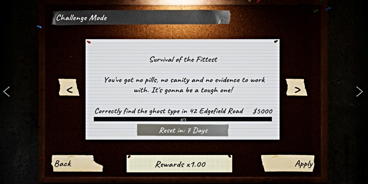 From here, scroll through the various difficulty settings until you find Challenge Mode. Select ‘Apply’ to set it as your next investigation. Remember that you must complete these weekly challenges at the location indicated on the board. The Challenge Mode difficulty doesn’t automatically select it, so go to the Maps board to your left and select 42 Edgefield Road.